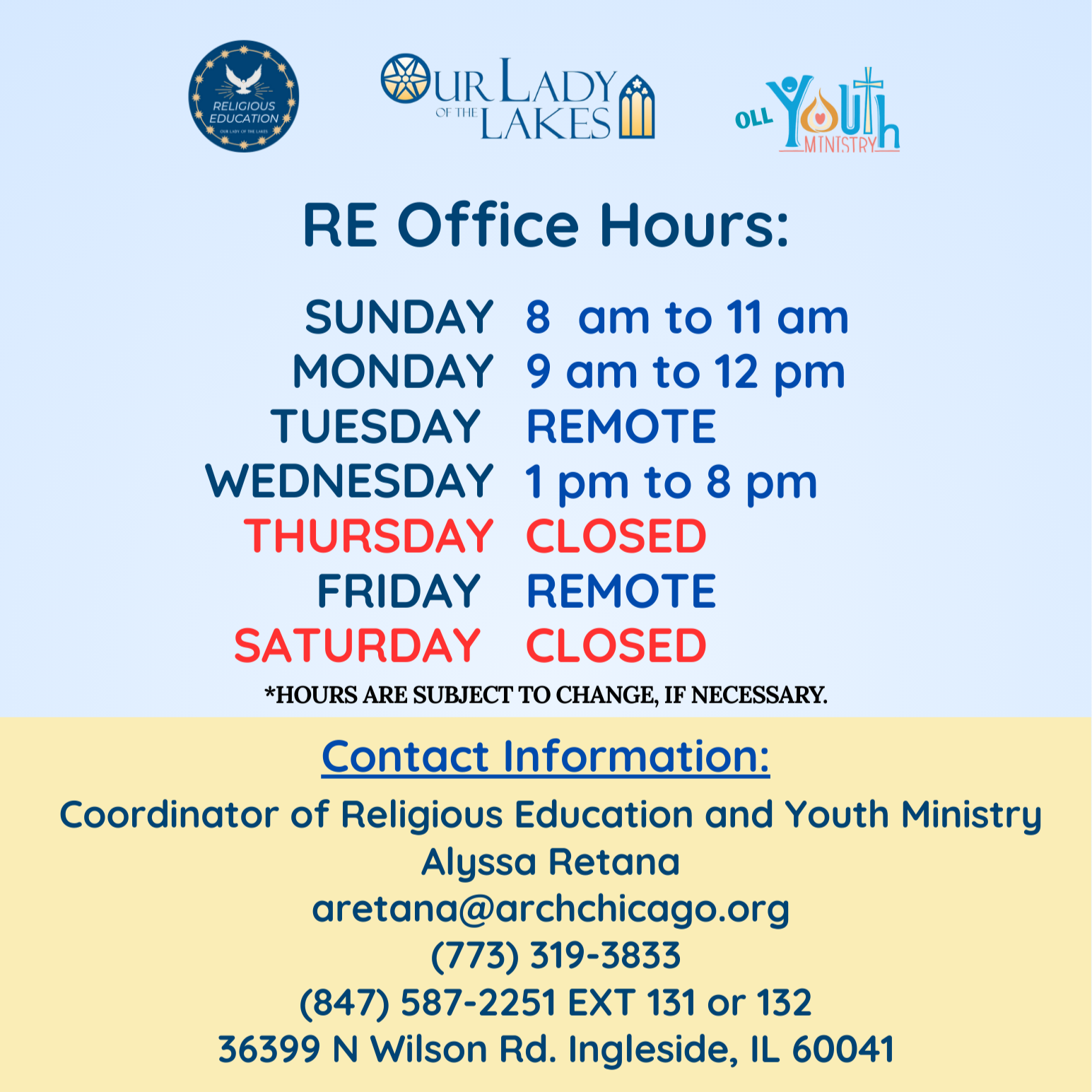 *Sacraments require two years of religious education. Any individual over the age of seven who has not been baptized must complete the two-year OCIA process.